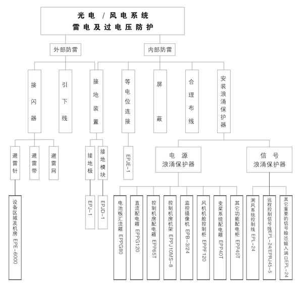 在各太陽能電池板電力匯流箱中安裝EPPG60防雷器,在直流配電柜中安裝EPPG100防雷器。